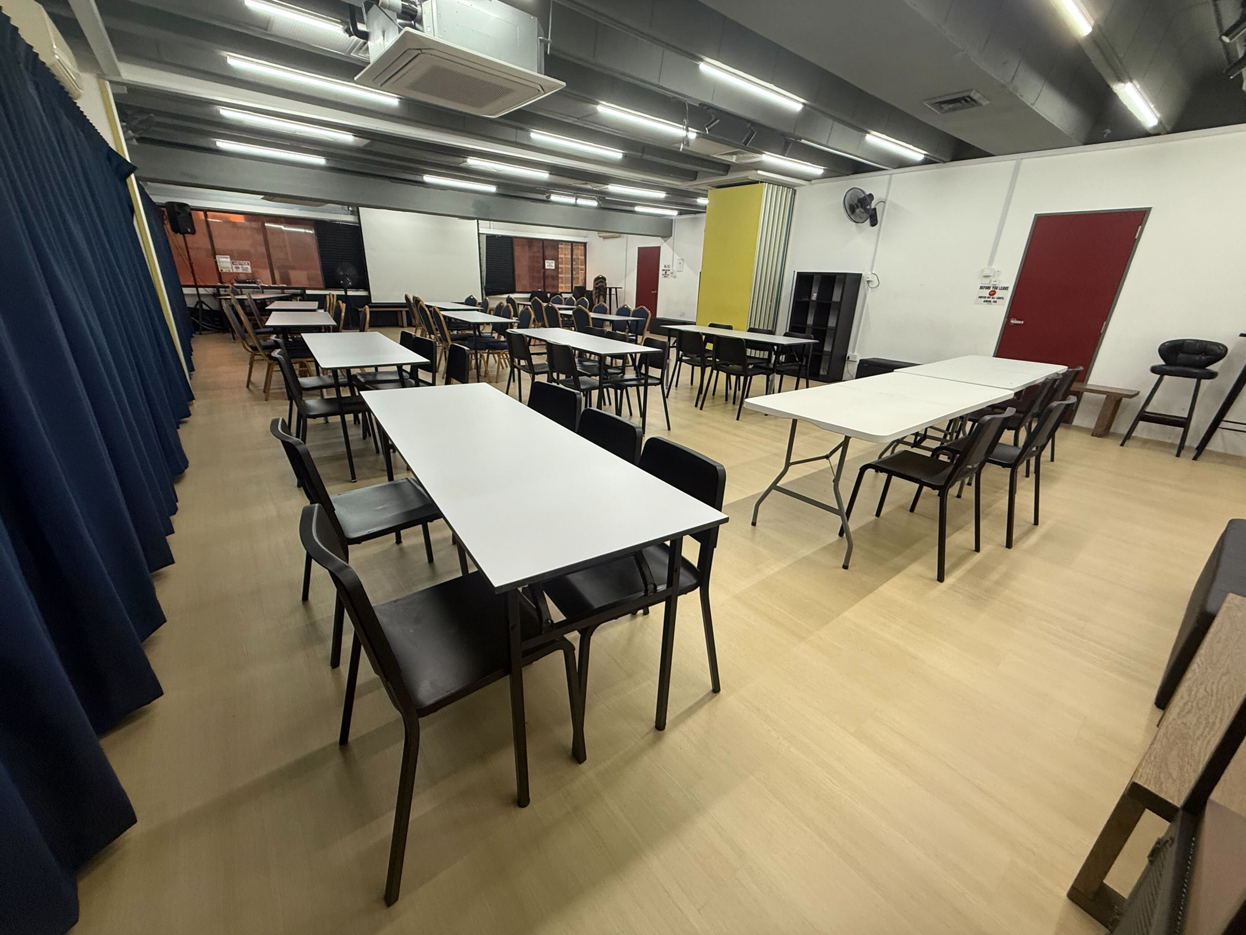 We provide pre-packaged multi-purpose rooms services. All packages include a set of chairs and tables, projector, speakers, 1 wired Microphone and Wi-Fi. Tables in the package can be swapped to chairs.